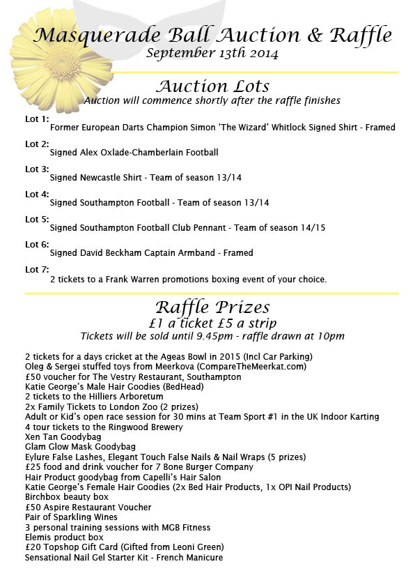 The THCF Masquerade Ball is tomorrow night so as the countdown is now over we are sharing every amazing prize and all the auction lots that will be on offer during tomorrow nights event. We have 28 raffle prizes and 7 auction lots. (Massive thank you to everyone who has donated and helped make this list possible!)